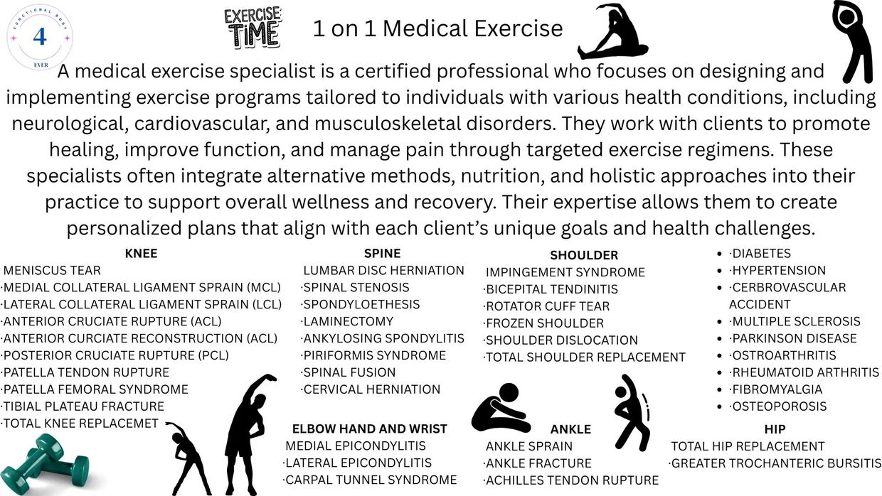 Our medical exercise programs are designed to help you achieve your health goals by combining cardio, strength training, and flexibility exercises. We work with you to develop a personalized exercise program that fits your needs and schedule. The exercise program is designed for each individual and is approved by your current medical professional. We create each exercise program to provide more function, helping you create a functional body 4 ever.